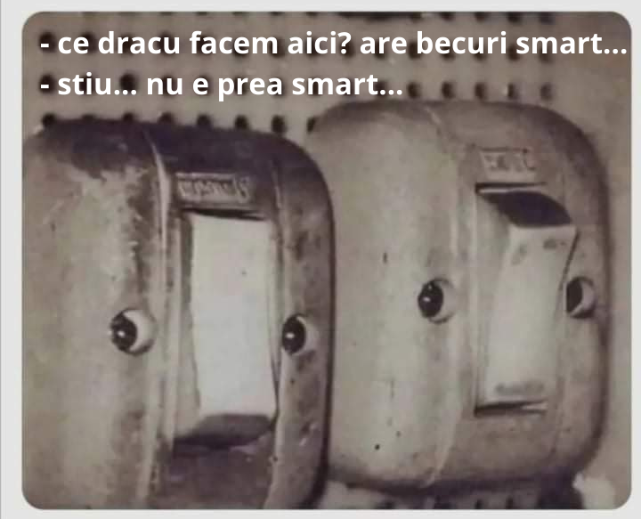 La urma urmei, adevarul e ca butoanele (intrerupatoarele) sunt facute pentru a fi apasate (actionate) si vina apartine 100% celui care a facut jumatate de treaba. Adica a schimbat becurile, dar nu a schimbat si intrerupatoarele pe unele compatibile cu becurile smart! E foarte simplu sa desfiletezi un bec dumb din dulie si sa infiletezi la loc unul smart. Comparativ cu situatia in care demontezi intrerupatorul de perete si incepi sa te rogi “sa fie bine, ca sa nu fie rau”, dar cand vezi ce ti-a lasat Dorel acolo mai bine pui casa la vanzare si faci alta de la zero. Da, cel mai probabil e nevoie de un electrician pentru operatiunea cu intrerupatorul. Adica sigur e nevoie de un electrician autorizat ANRE, care stie care e faza si care e nulul (ca sunt care nu stiu)… si e posibil sa nu treaca nulul pe acolo, poate e nevoie sa se traga un nul… poate e nevoie de o doza adanca sau de doza cu buzunar… Depinde de situatie si de ce se doreste mai exact. E “nitel” mai complicat daca se doreste o treaba cu adevarat smart. Fiindca lucrurile smart CHIAR trebuie gandite… din timp! Dar nu uitati ca: cu cat e mai complicata rezolvarea unei probleme smart cu atat rezultatul va fi unul mai smart.