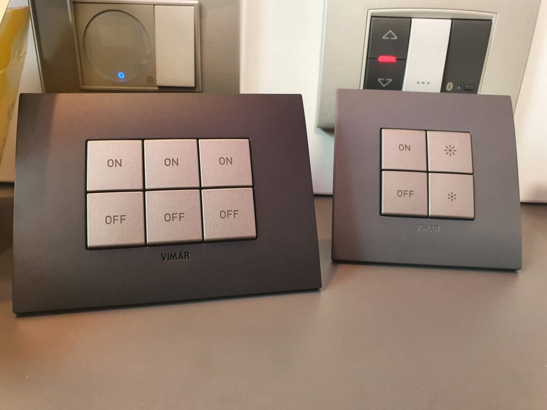 Mai avem nevoie de senzori KNX (push button KNX, interfata binara, senzor de miscare, temperatura, vant, etc.). Cum am mentionat anterior, actuatorul nostru multifunctional are mai multe intrari si astfel am putut conecta un senzor de temperatura la intrerea analogica si intrerupatoare cu revenire (push button) la intrarile digitale. Mai avem 2 interfete binare MDT care fac exact acelasi lucru ca si intrarile digitale de pe actuatorul DINUY, dar se monteaza in doza, in spatele intrerupatoarelor clasice. Si mai avem niste butoane de la VIMAR (01586 si 01581) care au si cate un releu (adica actuator) si care sunt nativ KNX, astfel se conecteaza direct la busul KNX.
