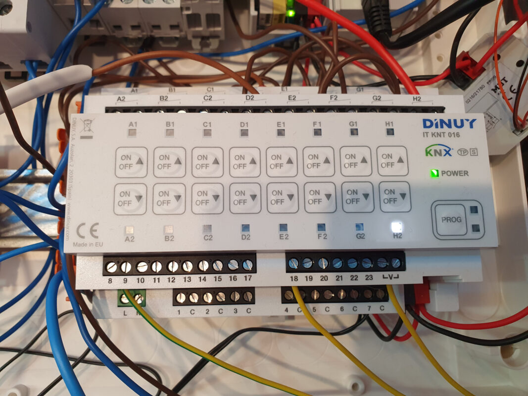 Pe urma avem nevoie de (cel putin) un actuator KNX (diferite relee, dimmer, termostat, etc.). Vestea buna e ca recent au aparut unele actuatoare multifunctionale care sunt ideale pentru experimente. Am ales un actuator de 16 canale de la DINUY (IT KNT 016), care mai are si 23 intrari (16 digitale si 7 analogice). Are 16 relee care pot fi configurate ca intrerupatoare sau pentru controlul jaluzelelor (2 canale), la intrarile digitale putem conecta senzori binari sau butoane push (intrerupatoare cu revenire), iar la intrarile analogice putem conecta senzori de temperatura si putem folosi actuatorul pe post de termostat. Totusi, as mentiona ca nu cred ca e foarte ok sa se foloseasca aceste dispozitive multifunctionale la proiecte mai ample, deoarece daca un dispozitiv pateste ceva, practic pierdem o multime de functionalitati (iluminat, prize, incalzire/racire, umbrire, alte functii care depind de aceste relee). E o solutie mai ieftina si ideala pentru experimente si proiecte mai mici, cu un buget limitat.