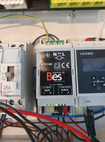 Pentru inceput avem nevoie de o sursa KNX. Tensiunea nominala a sistemului KNX TP este de 24VDC, insa sursele KNX asigura 30VDC pentru a compensa pierderile de tensiune. Device-urile KNX in general functioneaza corect intre 21 si 30VDC, deci avem o toleranta de 9V. Neaparat e nevoie de o sursa KNX si nu orice sursa de 24VDC e ok. Deoarece si alimentarea si transmiterea datelor se intampla pe acele doua fire (TP), sursa KNX are integrata partea de „choke” care echilibreaza lucrurile pe firele acestea. Sursa se va alege in functie de consumatori, dar nu trebuie exagerat deorece curentul nominal al dispozitivelor KNX e aproximativ 10mA. Eu am ales o sursa de 160mA de la BES pentru primele experimente pe KNX.