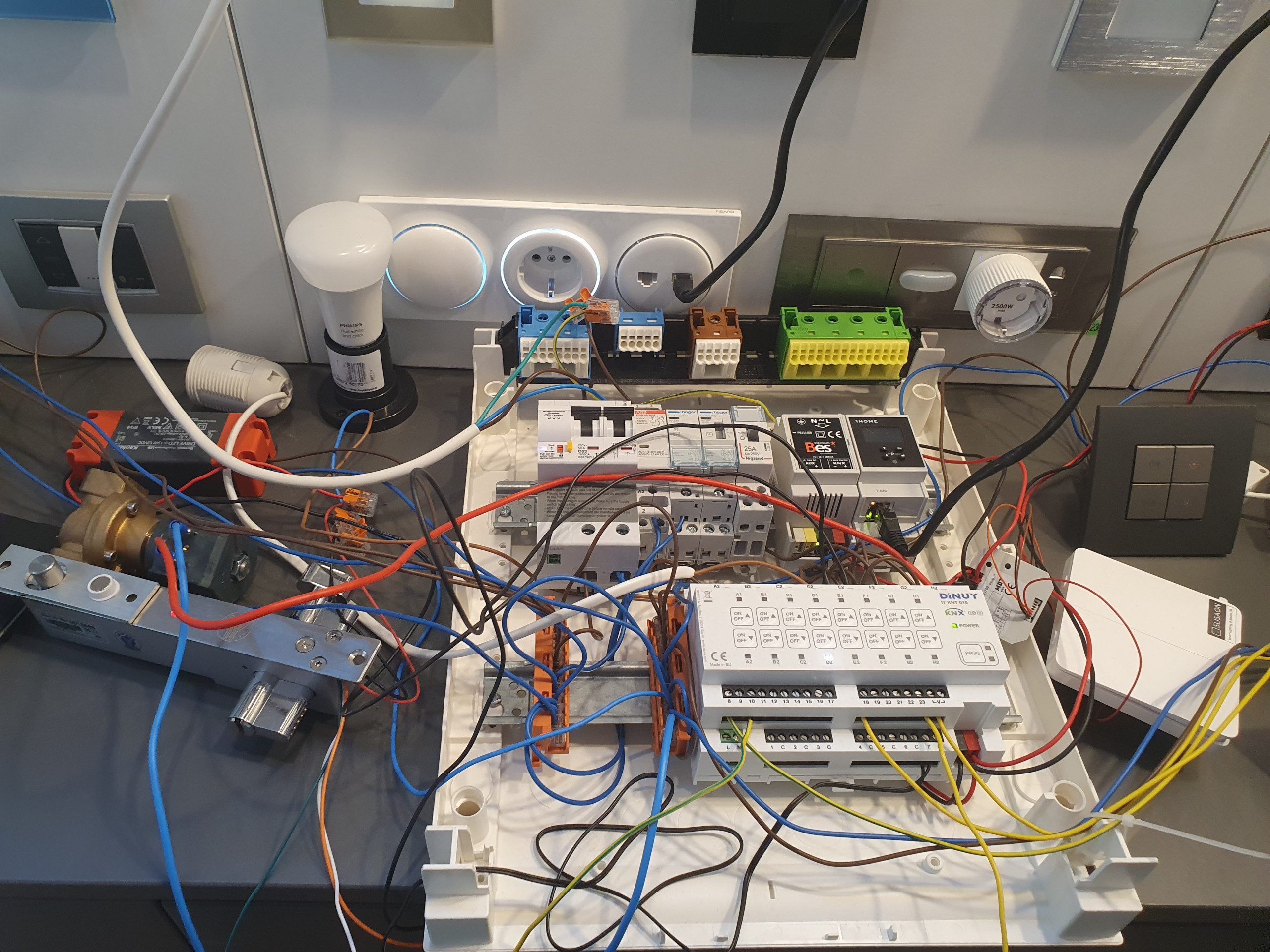 Legarea dispozitivelor e foarte simpla, se alimenteaza transformatorul de la reteaua electrica (faza, nul, impamantare), iar din secundarul transformatorului plecam cu cele 2 fire (twisted wires) catre restul dispozitivelor KNX. Transferul de date (comunicarea) intre dispozitive si alimentarea lor se intampla pe aceste 2 fire. Firele galben si alb le folosim doar in situatia in care dispozitive care au nevoie de alimentare suplimentara, de exemplu ecranele tactile.