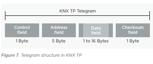 Dispozitivele KNX comunica intre ele prin asa zisele „telegrame”. Telegramele sunt in format binar si au structura aceasta: