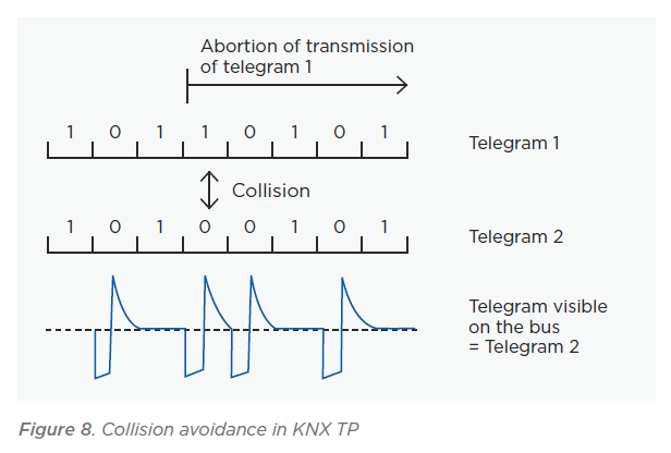 Toate dispozitivele conectate la bus pot schimba date intre ele. Cand un buton e actionat atunci se trimite o telegrama pe bus-ul KNX, iar dispozitivele „adresate” confirma primirea telegramei simultan.