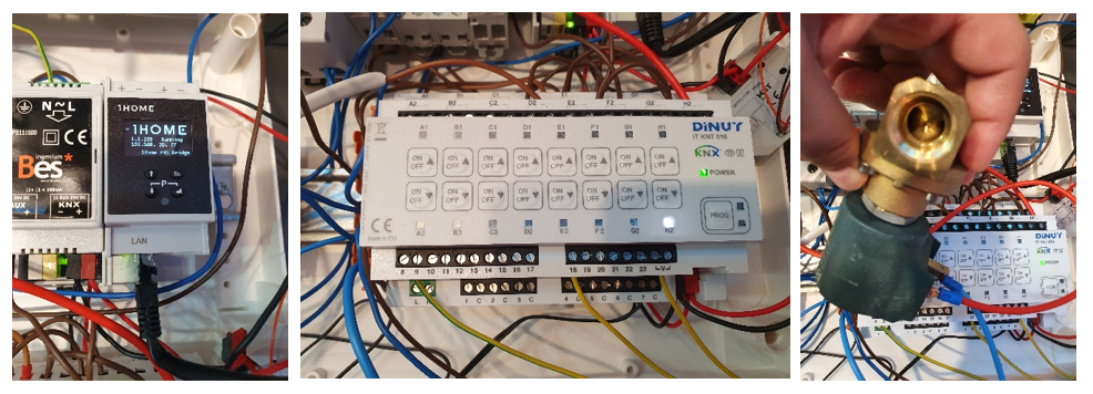 Mesajul ajunge mai departe la dispozitivul nostru KNX, care are o multime de functii, dar are si partea lui de inteligenta (calcul) si stie exact ca trebuie sa treaca pe OFF releul (actuatorul) H2. Prin urmare electrovana ramane fara curent electric si opreste alimentarea cu apa din locuinta. Locuinta scapa fara inundatie fiindca informatia transmisa de catre senzor a ajuns cu bine la actuator.