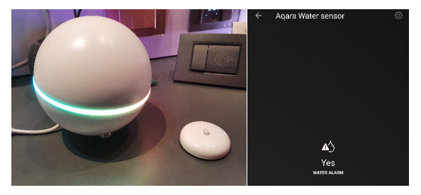 Avem senzorul Aqara care detecteaza apa si transmite informatia „inundatie” catre o centrala prin ZigBee.
