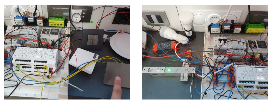 Butonul tactil cu releu este conectat la intrarea digitala de la dispozitivul KNX. Acesta e setat in asa fel incat atunci cand primeste un impuls (de la releul din interiorul intrerupatorului touch) pe intrarea digitala 10, atunci sa inchida contactul de pe canalul E2. La comunul releului avem conectat minusul de la o sursa de 12VDC, lar la contactul normal deschis conductorul pe care primeste comanda yala electromagnetica. Atunci cand releul inchide contactul pentru o secunda yala se deblocheaza.