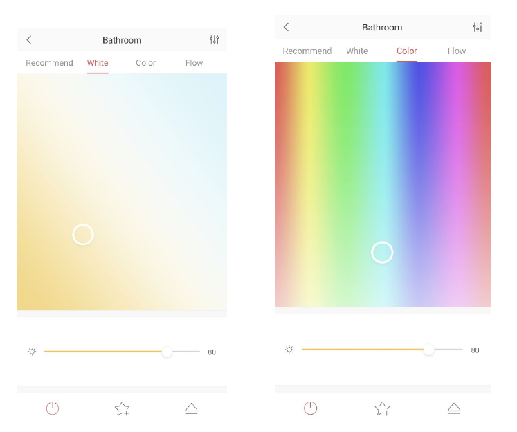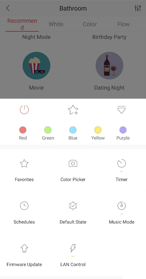Are si modul „flow” cu ajutorul caruia se schimba diferite culori presetate cu o viteza configurabila. Si Music Mode in care, cu ajutorul microfonului din telefon, culorile se schimba dupa sunetele din jur.