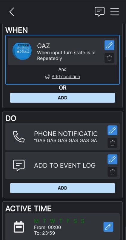 - Partea de „Reverse inputs” e cam optionala. Am zis anterior ca in mod normal as monitorizare prezenta fazei pe NO (impulsul acela de o secunda), dar din cauza celor 30j de volti vagabonzi sunt nevoit sa monitorizez lipsa fazei pe NC si din cauza aceasta am selectat si optiunea Reverse inputs. Daca nu aveam Reverse inputs, atunci scenariul era „When input state is off” si nu „When input state is on”… total irelevant.