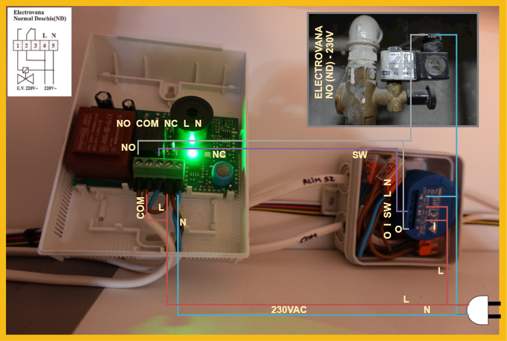 - senzorul de gaz e alimentat dintr-o priza cu Faza+Nul la 230V si are un releu care la randul lui are NO (contact normal deschis), COM (comun) si NC (contactul normal inchis)